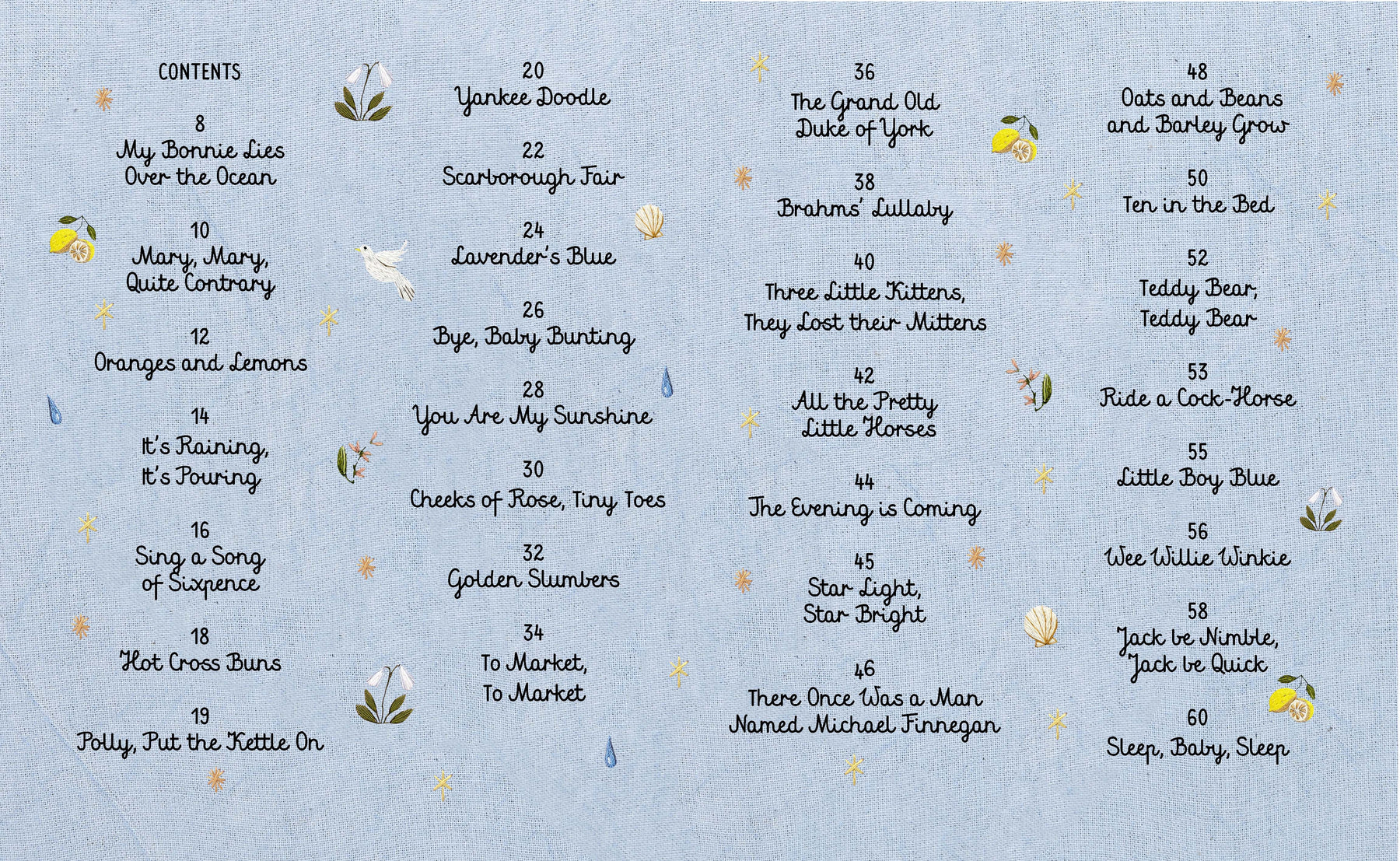 This treasury gives parents the opportunity to rediscover just how useful (and calming) 30 of the best-loved lullabies and nursery rhymes are in one, beautiful volume. Stunningly embroidered illustrations for each rhyme offer little ones a visual delight and will make this book a keepsake to treasure.