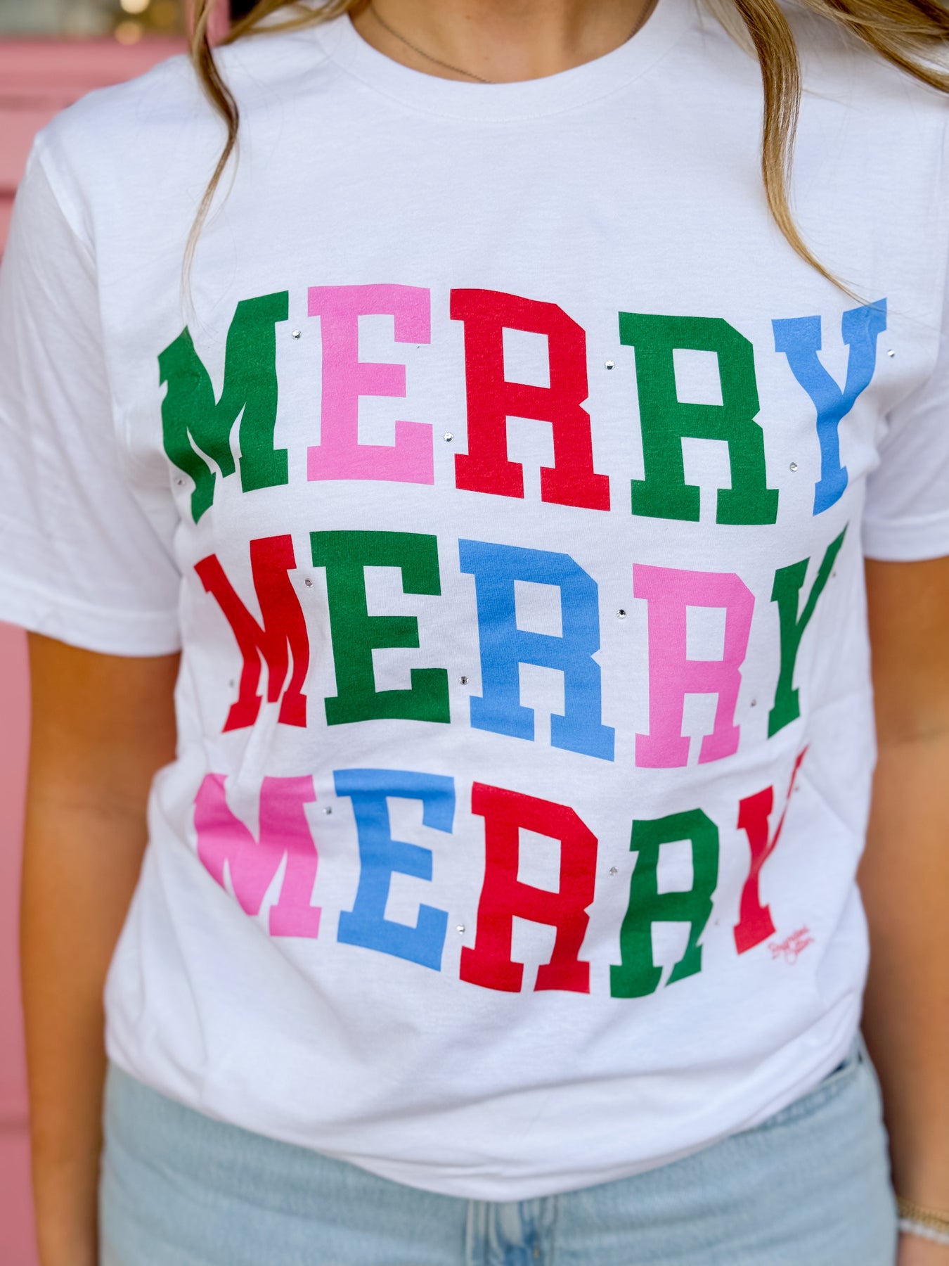 Add this cute Curved Merry Tee from Branded Cotton. A signature soft white tee adorned with crystal embellishments, this tee is more than just an item of clothing; it's a testament to their dedication to quality and comfort.
