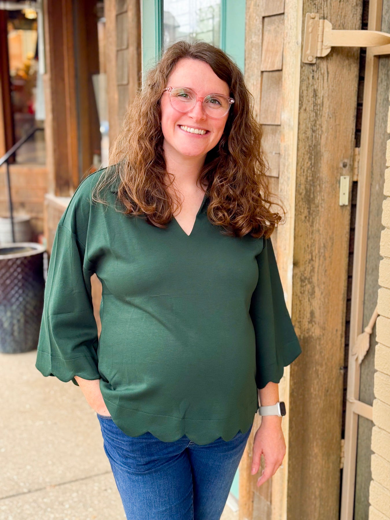 3/4 sleeves V-neck top with scallop edge detail, collared neckline.