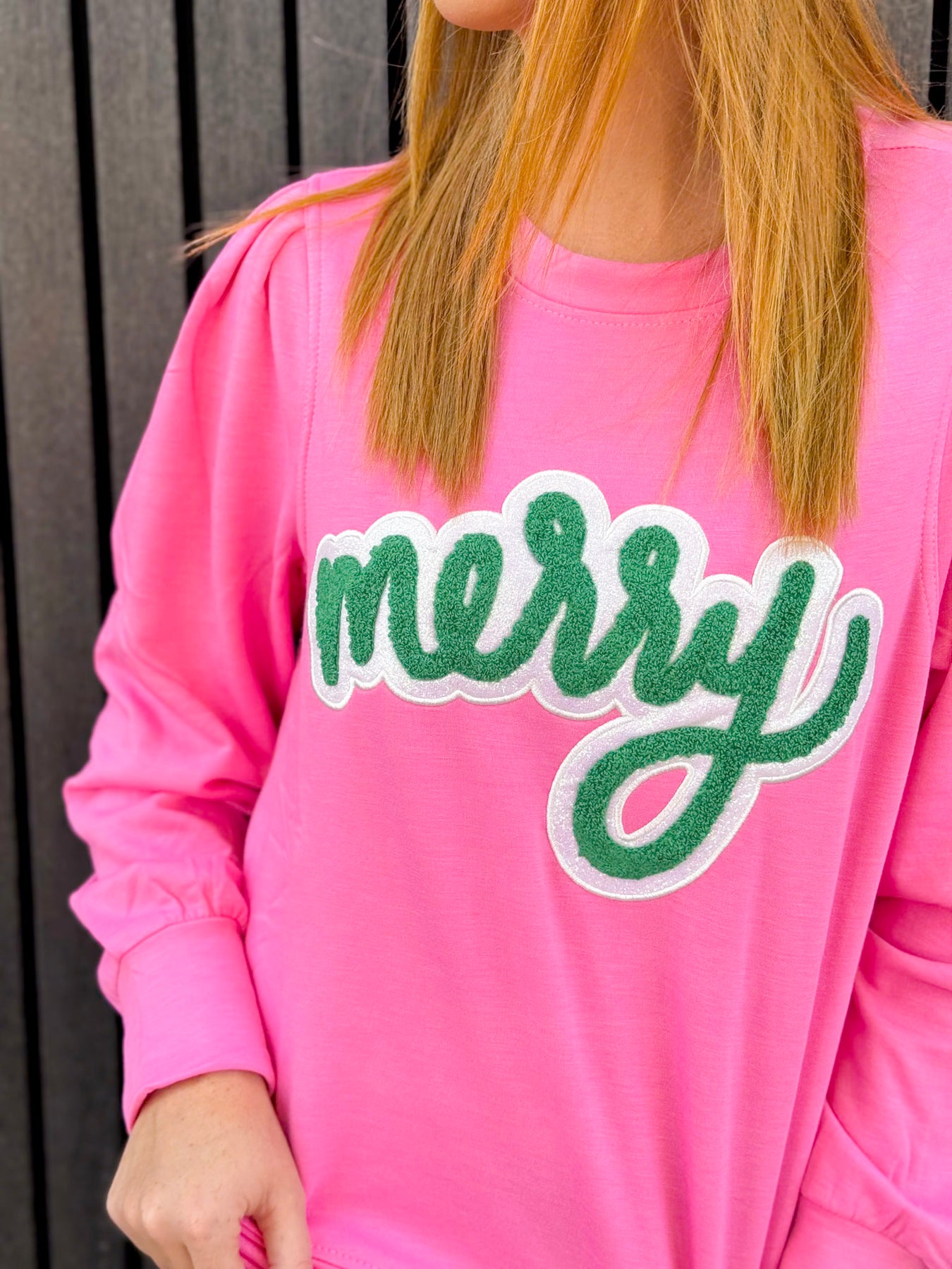 Make a festive statement with this bright pink “Merry” sweatshirt. Featuring playful chenille-style lettering with a white glitter background and subtle puff sleeves, it blends cozy comfort with a touch of holiday glam. Perfect for pairing with jeans or leggings, this cheerful top is a must-have for holiday parties, casual outings, or cozy nights by the fire.