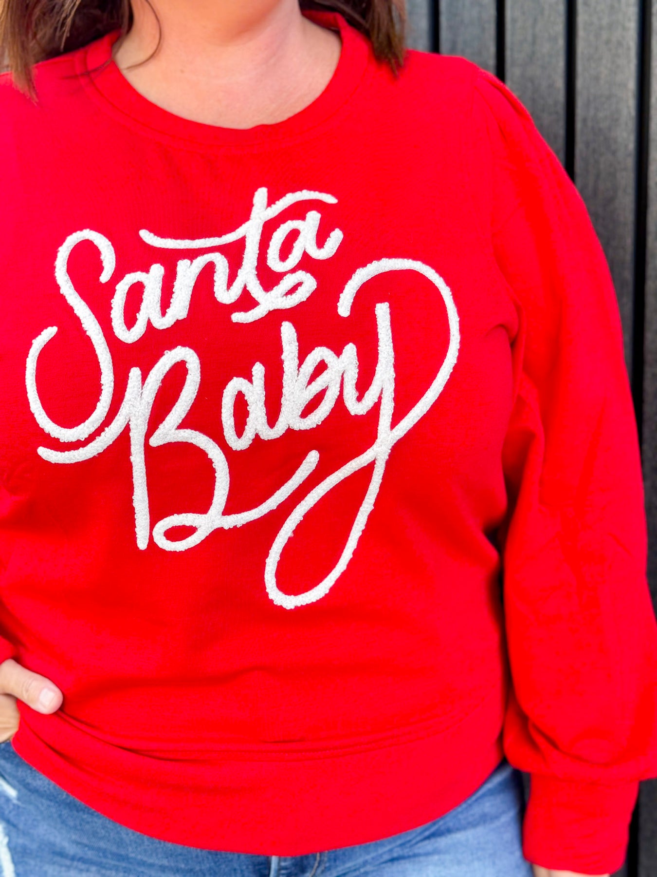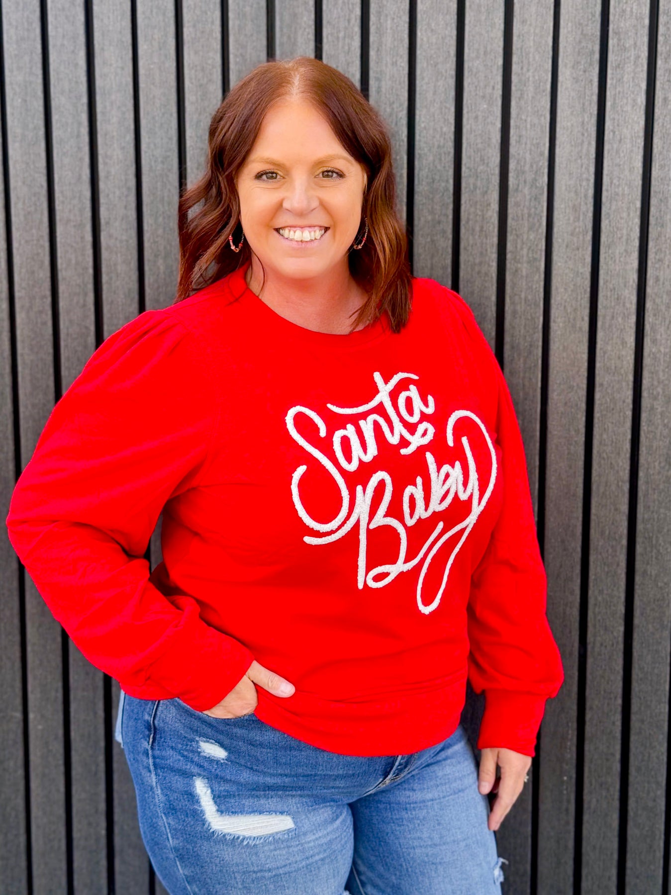 Make a festive statement with this bright red “Santa Baby” sweatshirt. Featuring playful chenille-style lettering and subtle puff sleeves, it blends cozy comfort with a touch of holiday glam. Perfect for pairing with jeans or leggings, this cheerful top is a must-have for holiday parties, casual outings, or cozy nights by the fire.