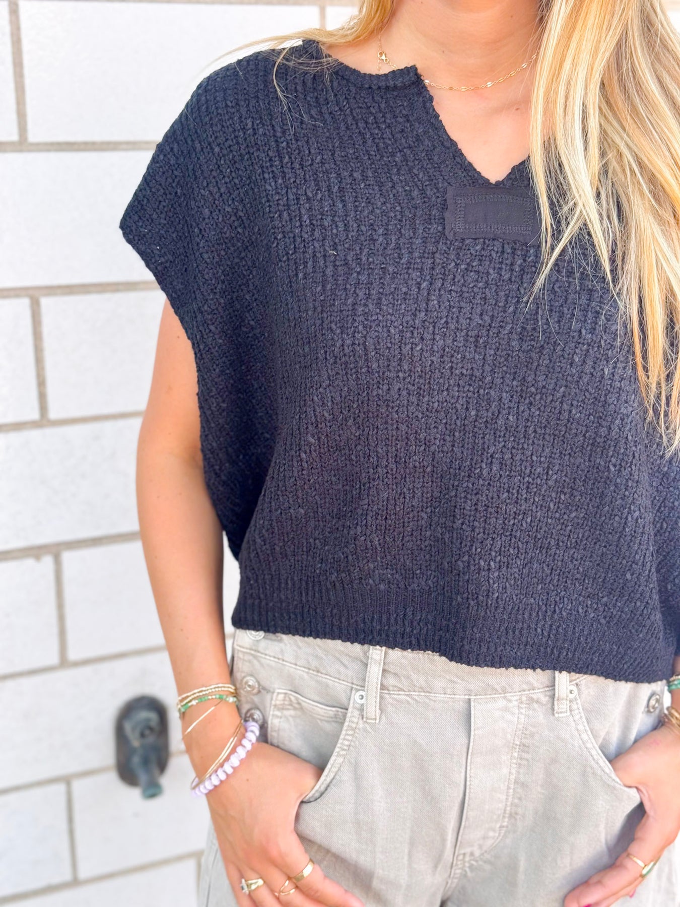 This textured knit top features a soft gauge open weave with a notched neckline, tonal patch detail, ribbed hem, and relaxed cap sleeves for an effortlessly laid back feel.