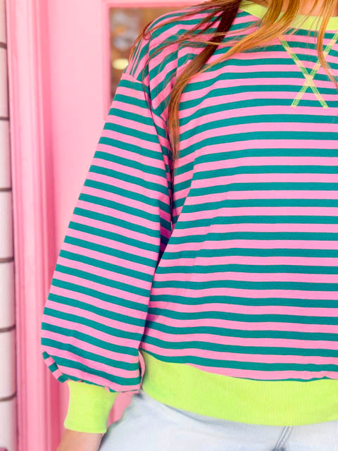 Long puff sleeves stripe sweatshirt with v-notched neckline, solid contrast binding detail.