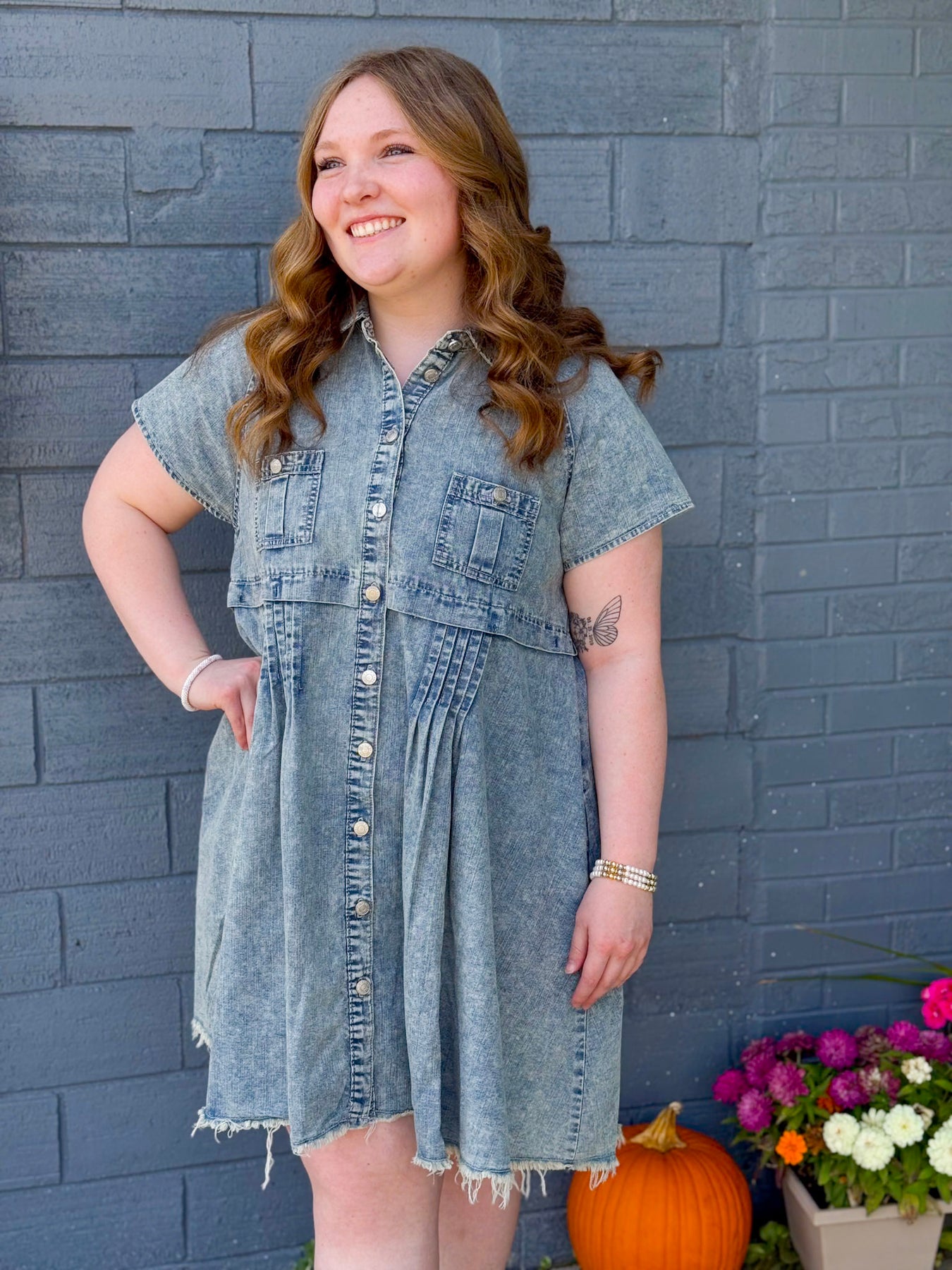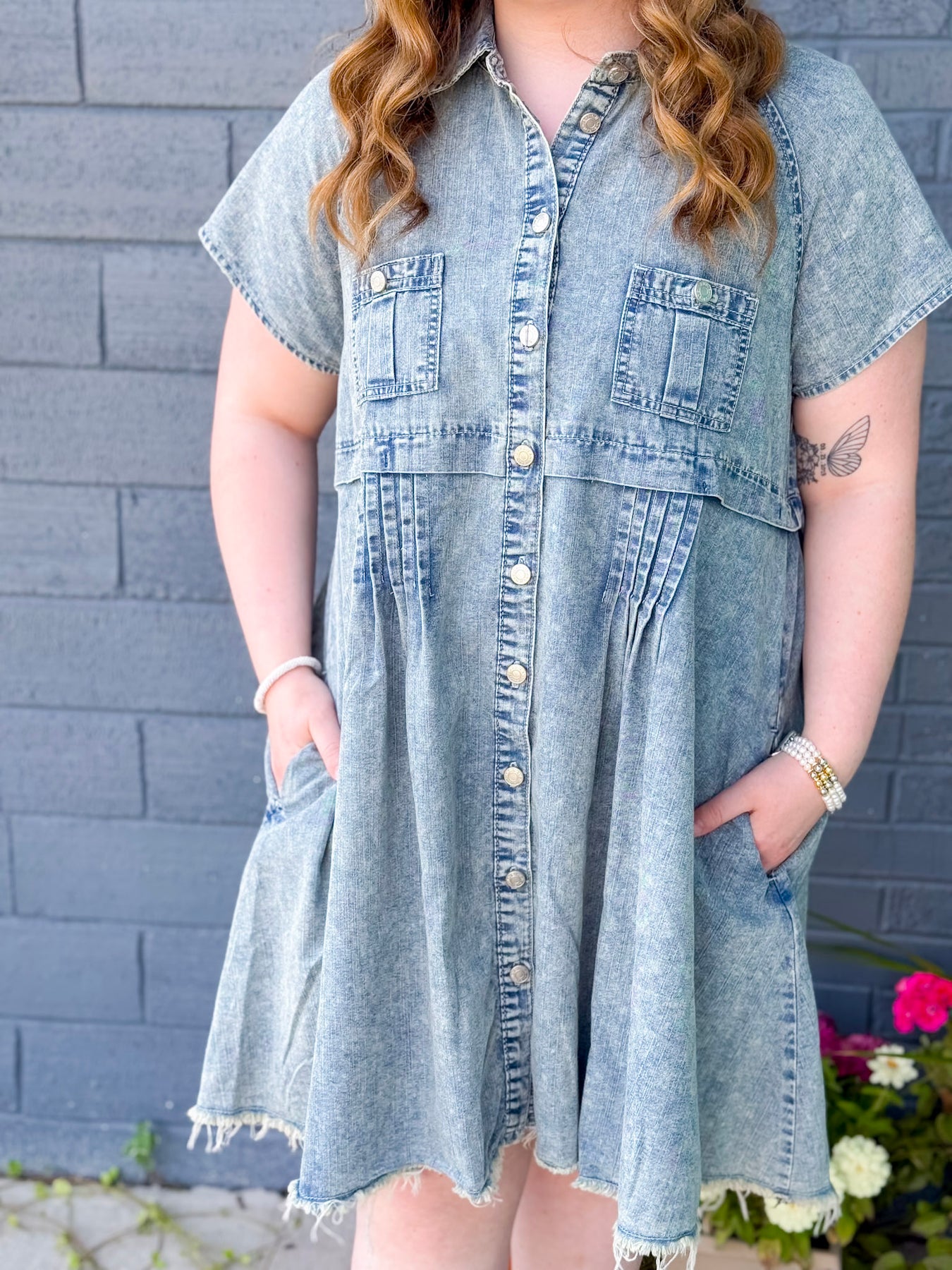 Mineral washed short sleeve mini dress featuring a button down front, a collared neckline, two front chest pockets, added seams and pleats for detail, two side hip pockets, a frayed bottom hem, an inverted pleat in the back and is a loose fit silhouette.