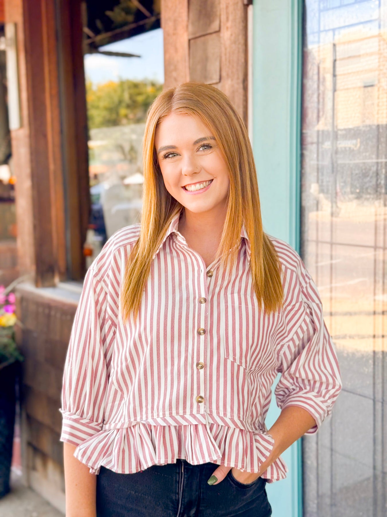 This striped top features a collared neckline, button up front, drop shoulders with buttoned cuff sleeves, a single chest pocket, and a ruffled hem for a playful twist on a classic silhouette.
