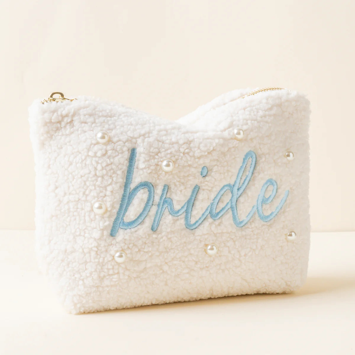 Add a cozy touch to your essentials with our Bride teddy pouch. Crafted from soft sherpa fabric, this pouch features a wipeable lining for easy cleaning, and gold zippers and hardware for a polished look. The interior is lined with a fun printed fabric, making it as stylish on the inside as it is on the outside. A perfect size for keeping your favorite items organized, and can be beautifully paired with our other teddy pouch sizes to create a matching set.