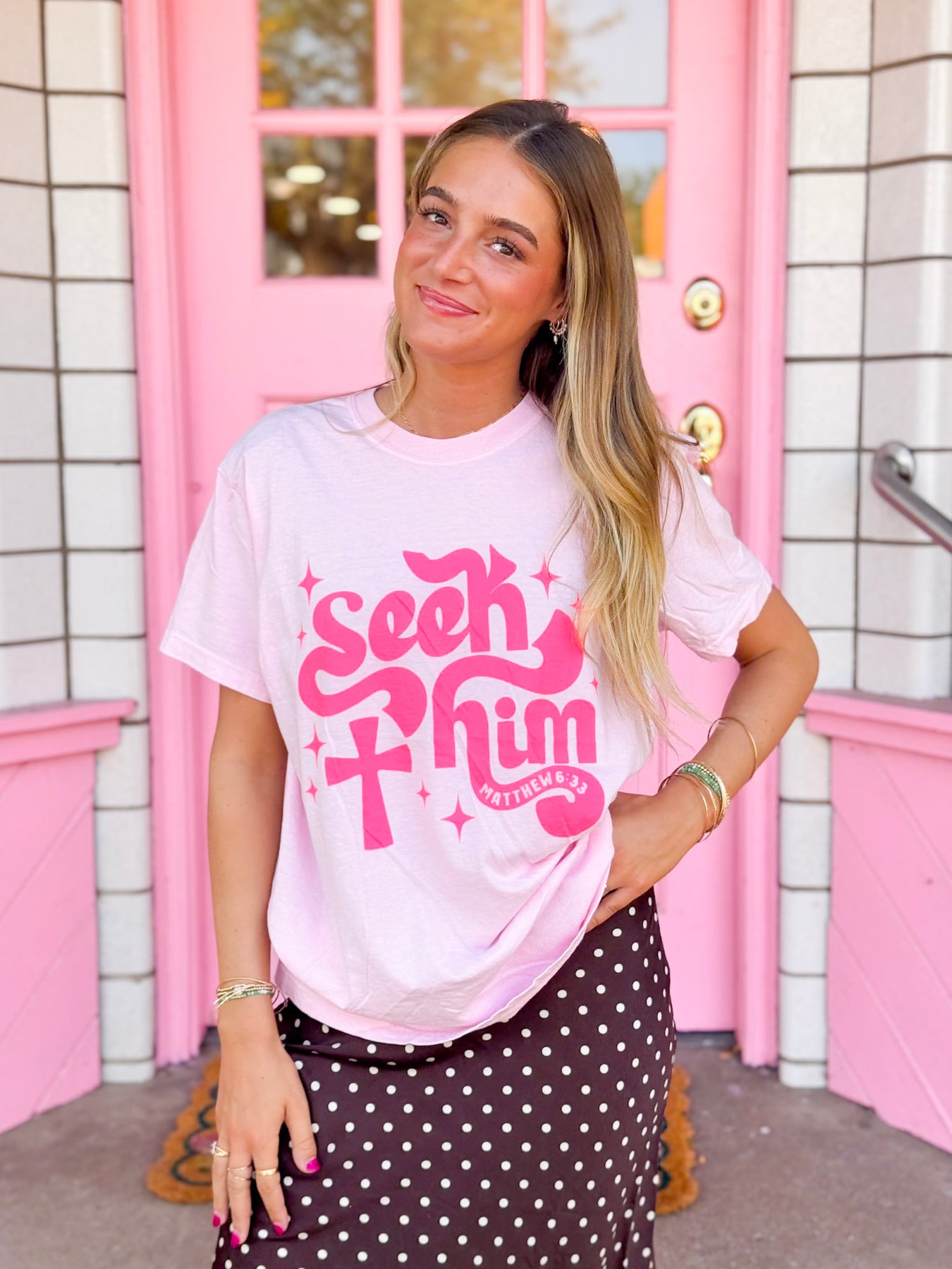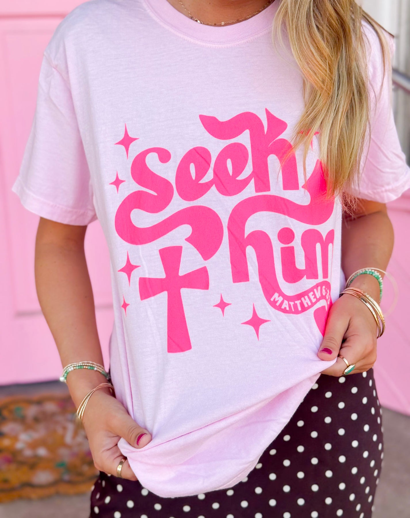 Find your faith with the Seek Him Tee. This quirky and playful shirt boldly declares your devotion while keeping you comfortable. Don't take yourself too seriously, just let your outfit speak for itself!
