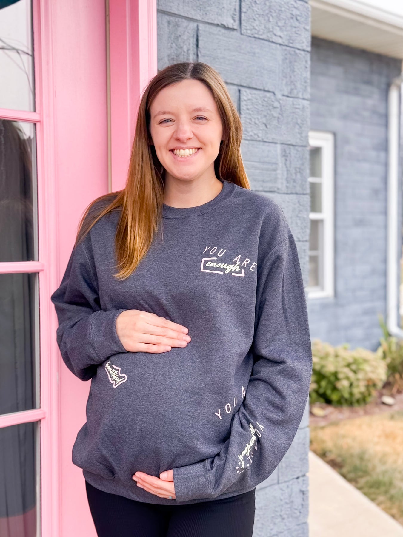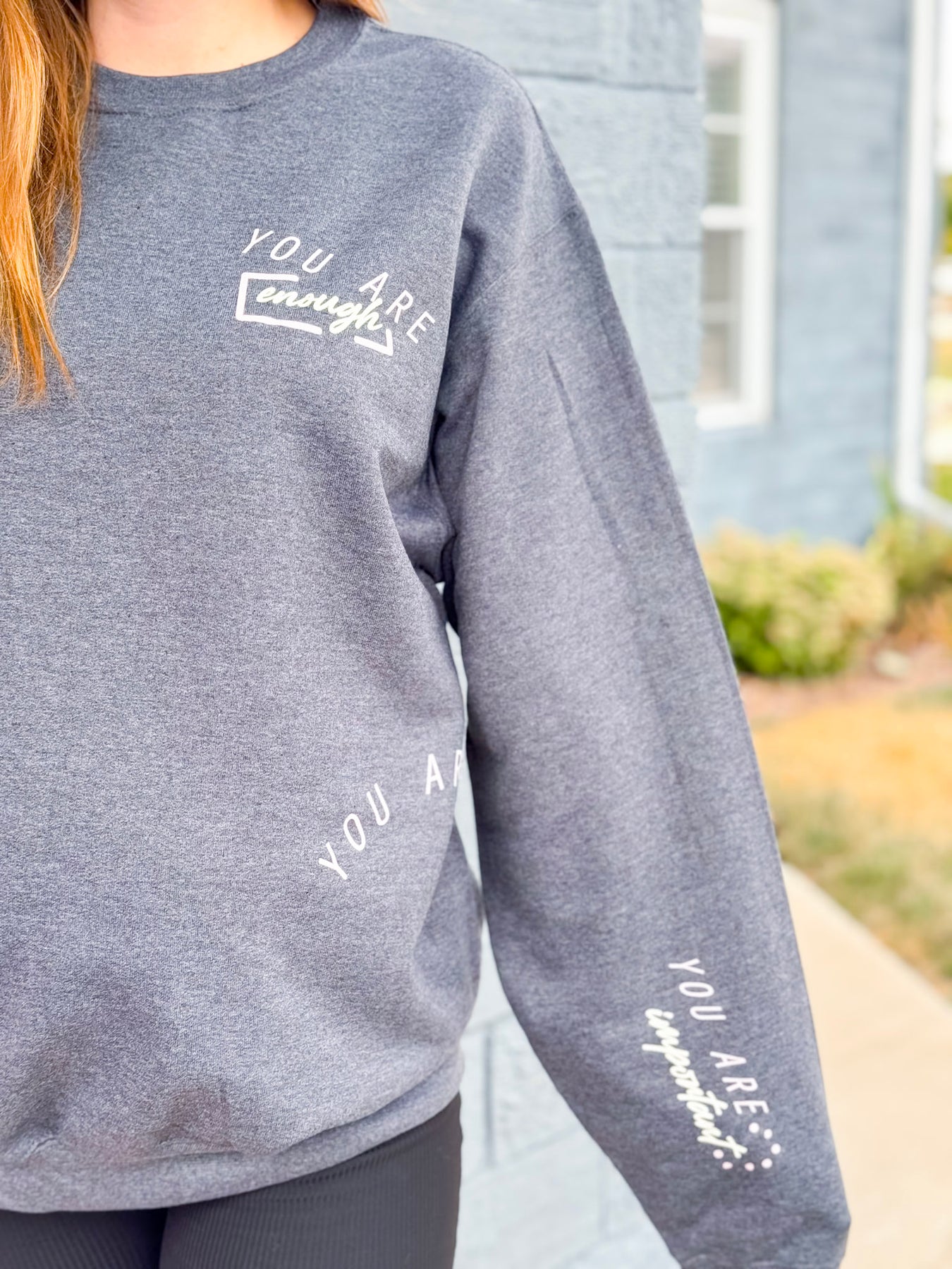 Wrap yourself in comfort and affirmation with the You Are Enough Sweatshirt. Featuring soft charcoal fleece and uplifting phrases like “you are enough,” “you are amazing,” and “you are important,” this cozy crewneck is designed to brighten your day and anyone else's. Pair it with the matching joggers for the full feel-good fit.