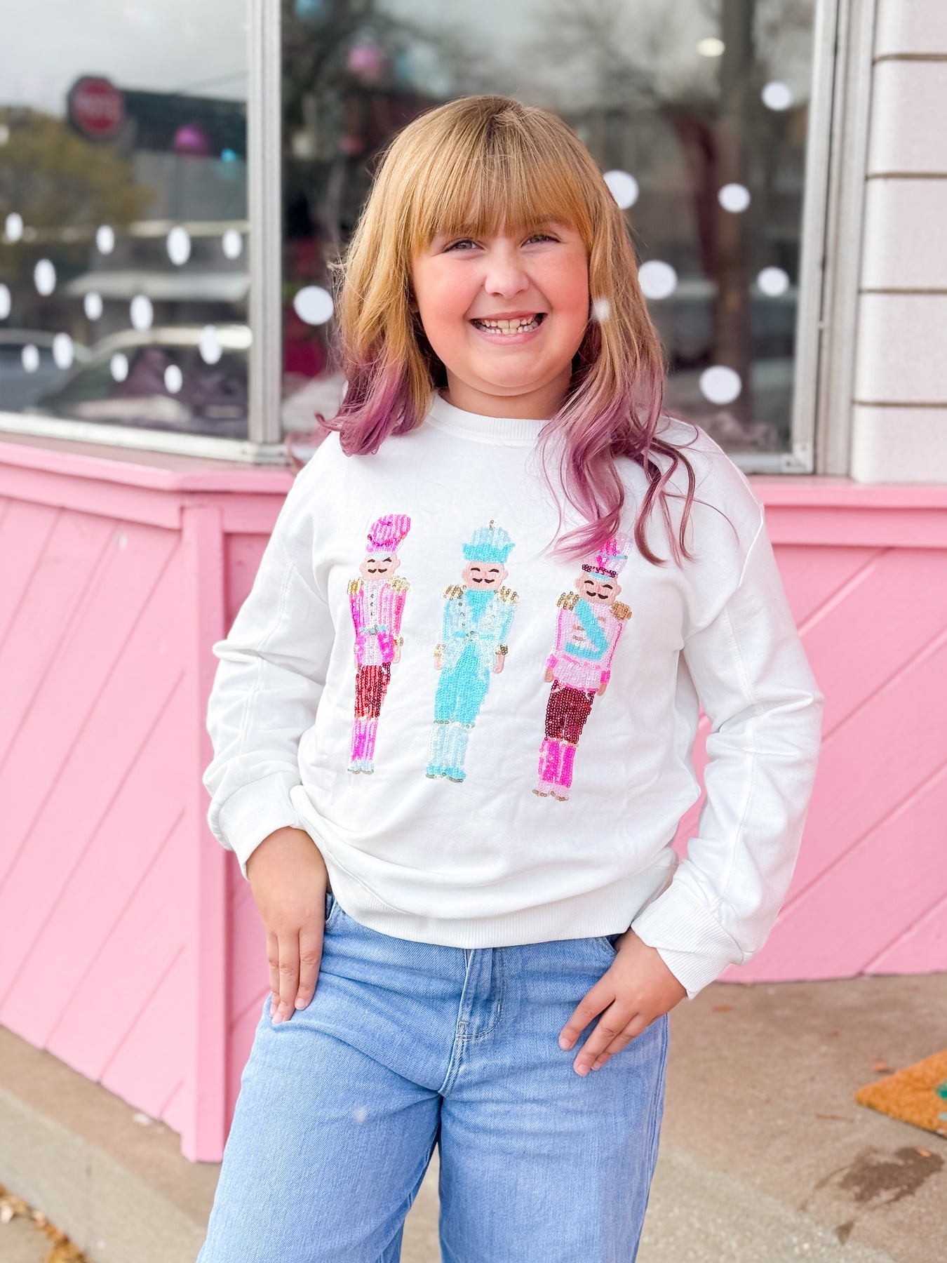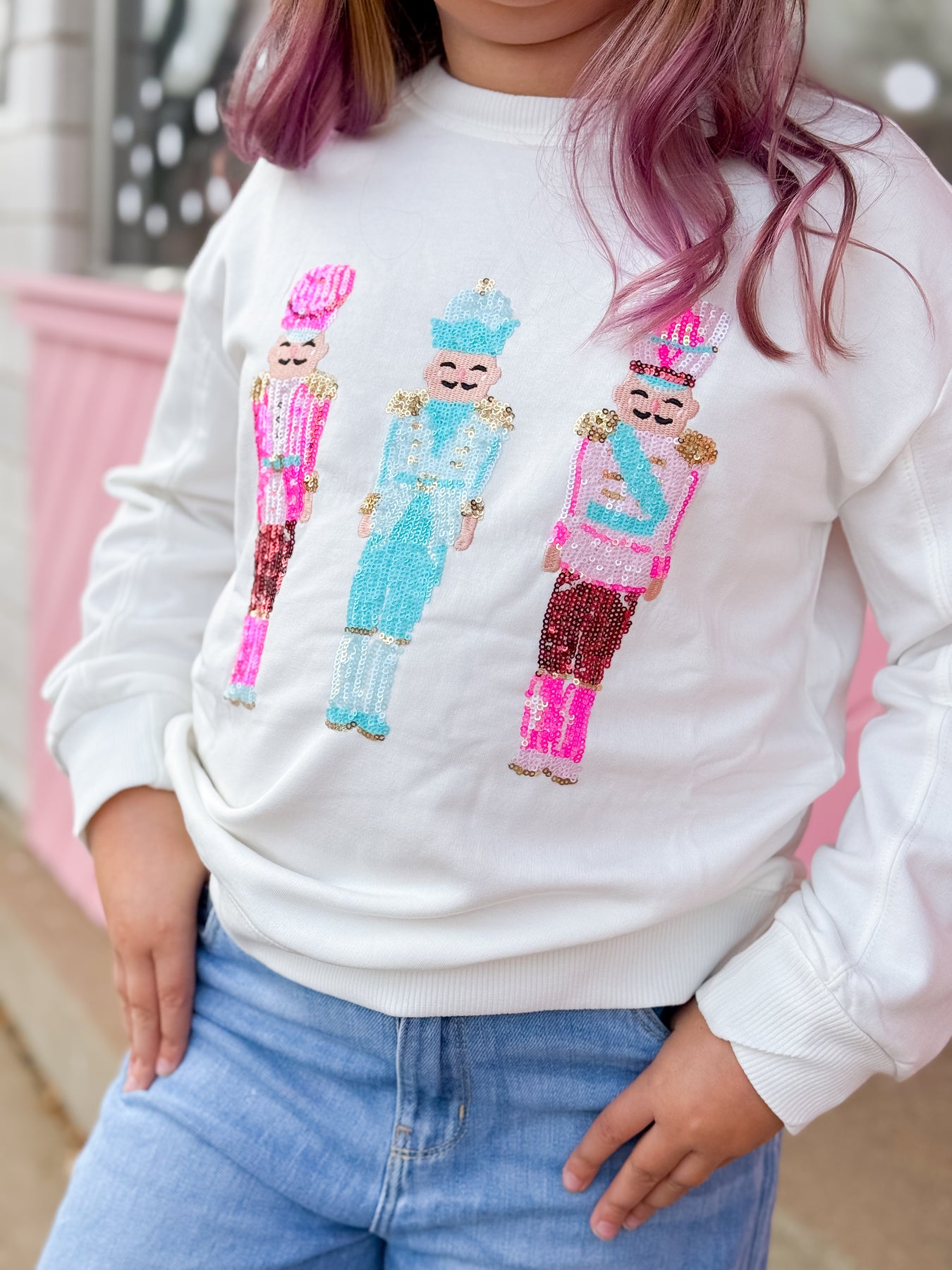 Get festive in the Sarah Sweatshirt, featuring three sequined nutcrackers that sparkle with every move! The creamy background makes these playful holiday icons pop, bringing a joyful touch to your cozy, everyday look. Perfect for spreading cheer with comfy style!