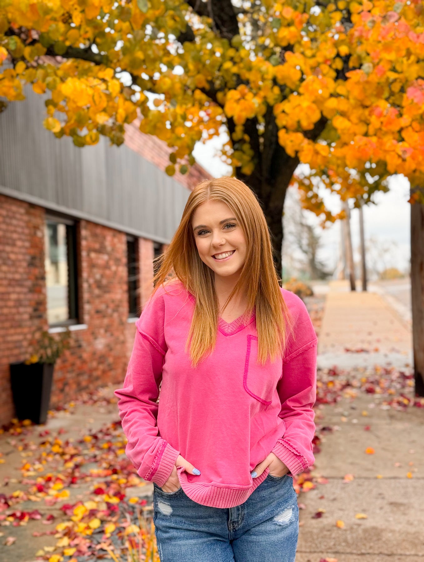 Drop shoulder wide v neck casual top with raw cut edge accent, chest pocket, ribbed binding detail.