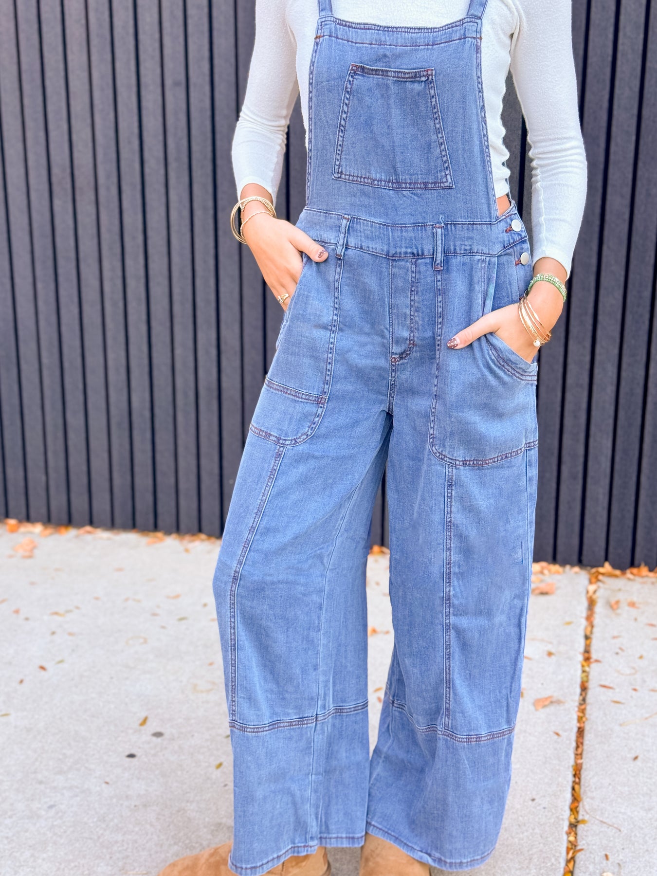 These wide-leg jumpsuit pants offer a relaxed fit for ultimate comfort. They feature a distinctive front bib with a large pocket, complemented by convenient side button closures and practical front patch pockets. Exposed seam detailing adds a touch of style, while adjustable shoulder straps ensure a perfect fit.