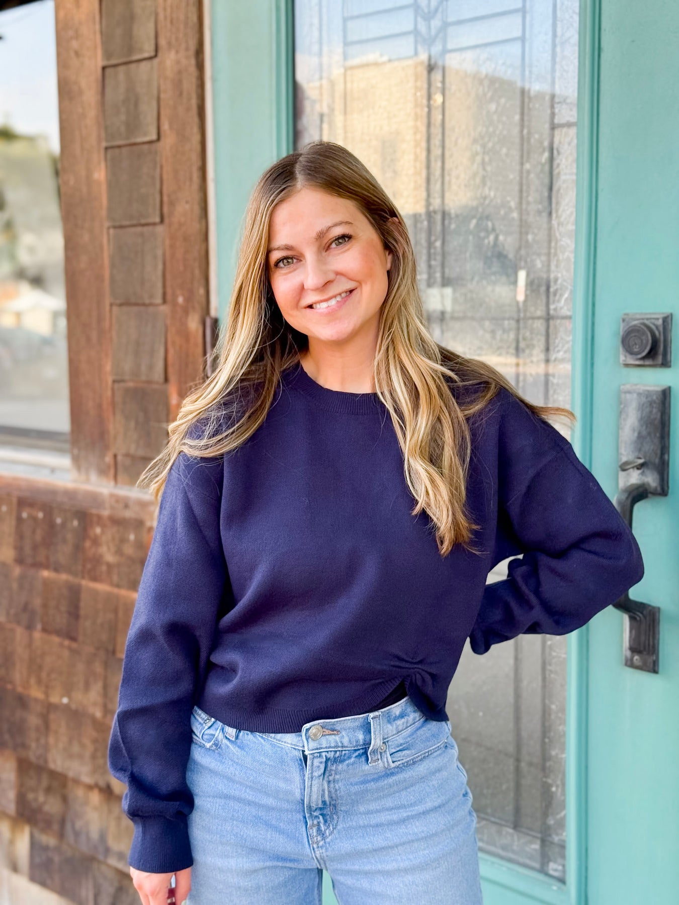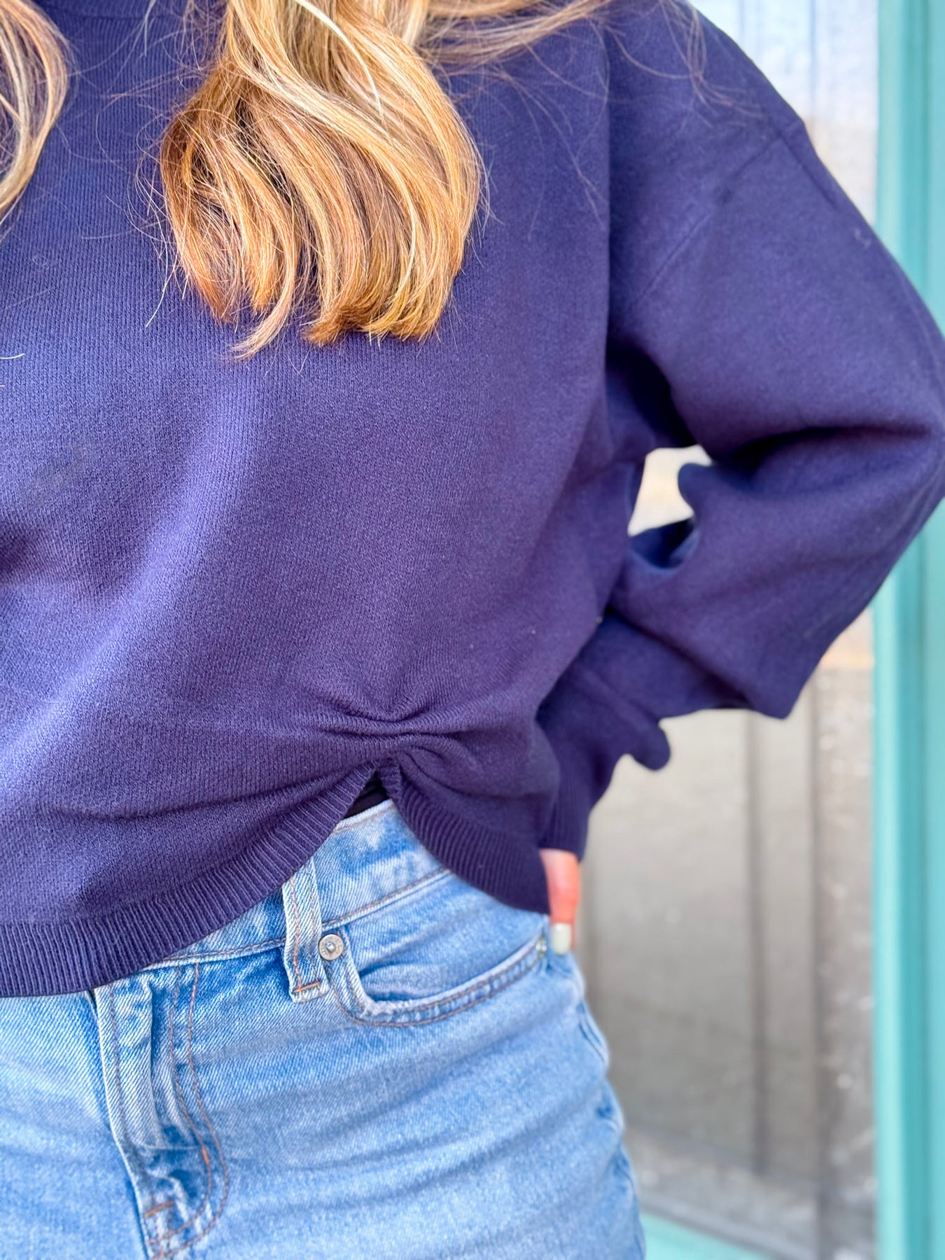 Long sleeves soft texture sweater top with knot accent, drop shoulder.
