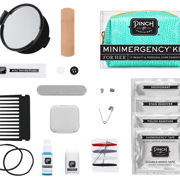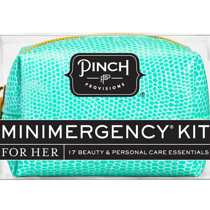 Snake print meets sweet pastels in the snake charmer minimergency® kit by Pinch Provisions®. With 17 beauty, personal care, and style essentials, our signature petite pouch contains everything a gal needs...in a pinch®!